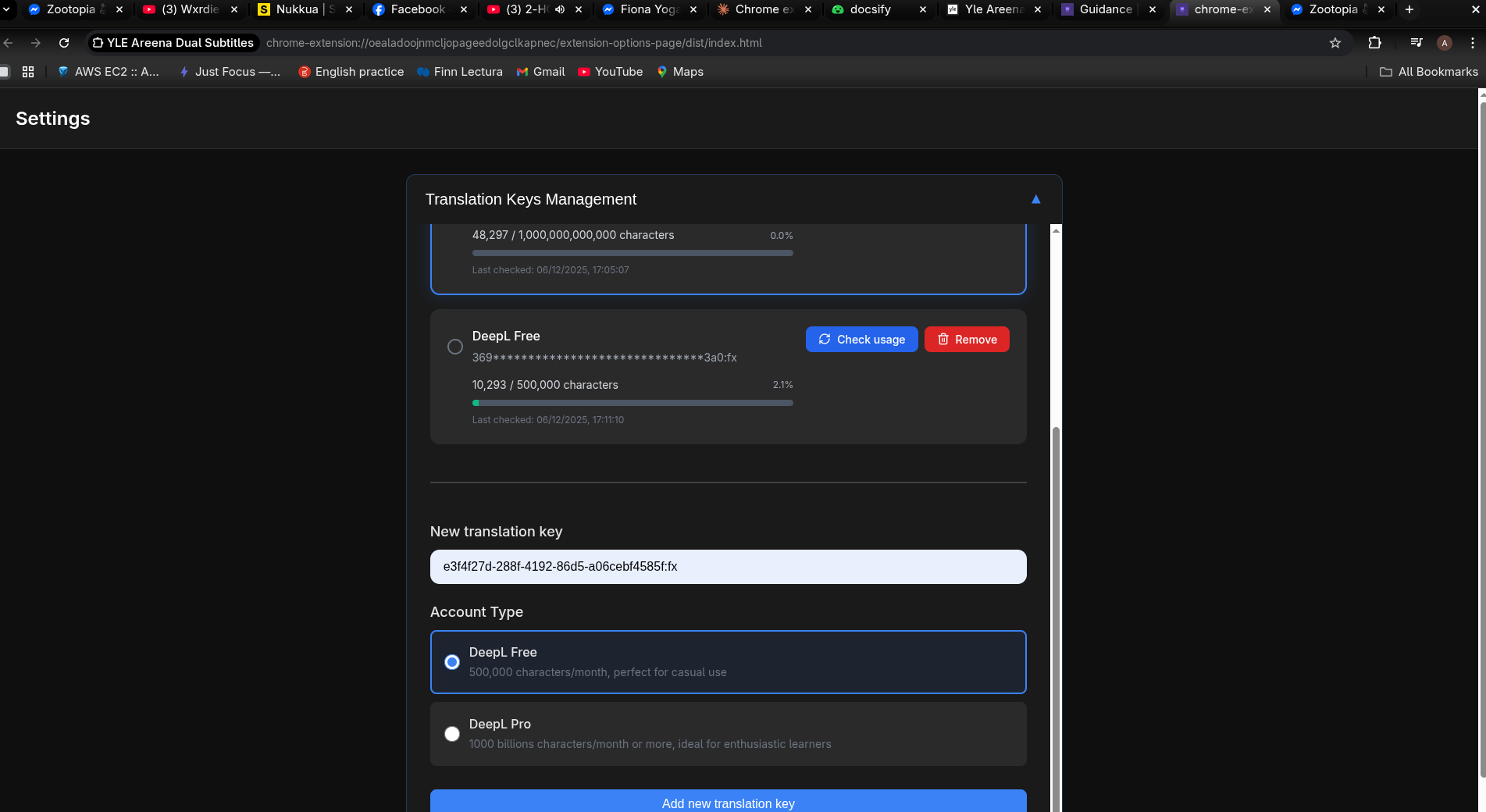 Copy the entire key and paste it in the extension's options page, select your account type (Free/Pro), and click "Add new translation key"