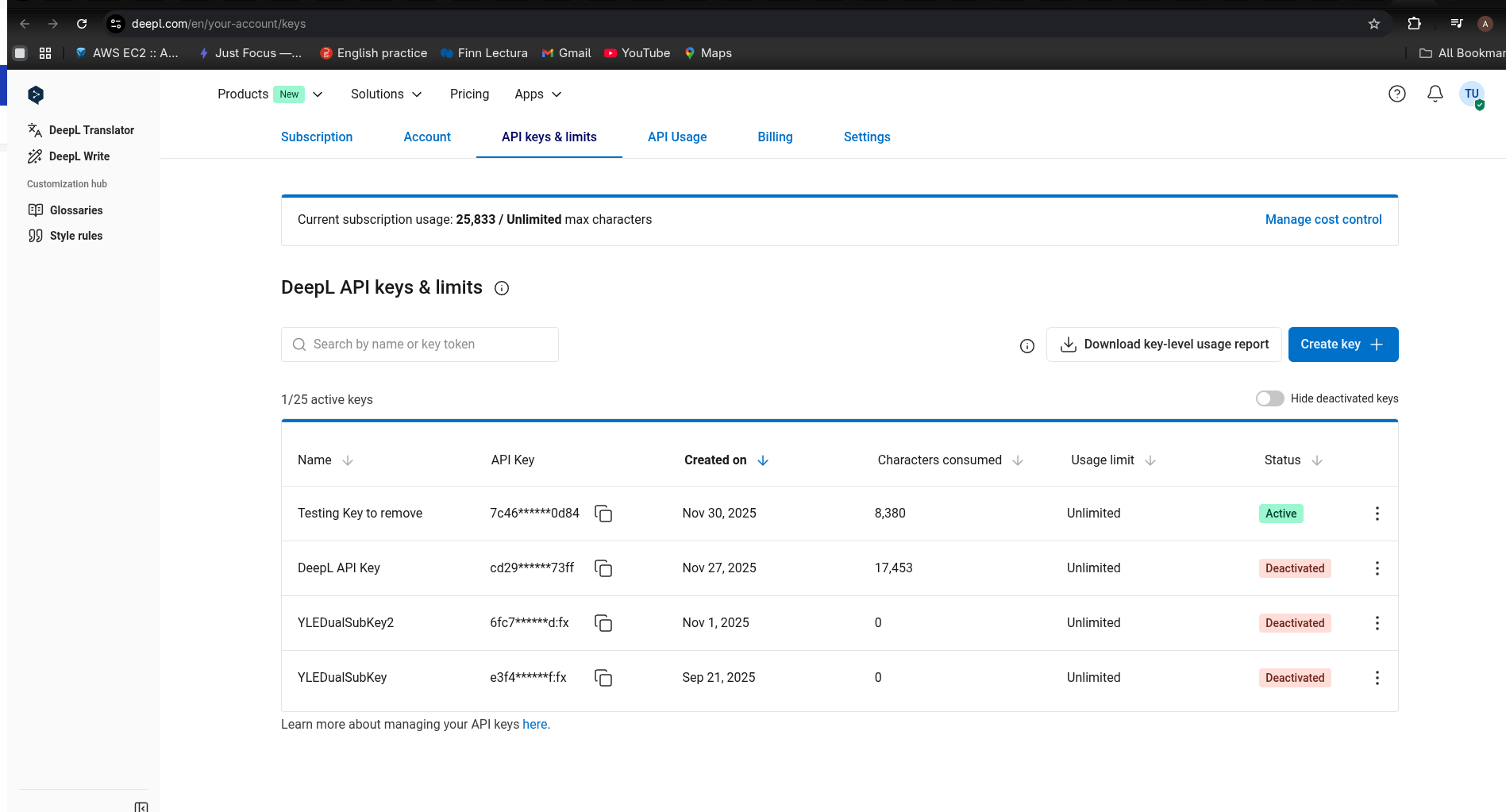 After the subscription has been made, go to DeepL Key Page. Click the "Create Key" button and give it a name (e.g., "YLE Dualsub translation key")